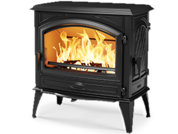 飾りのない大きな窓から見える薪ストーブの美しい炎。幅広い天板部分での料理をお楽しみいただける、シンプルながら力強い魅力を持つ、飽きのこない薪ストーブです。