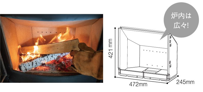 日本人の暮らしに適したサイズ感。40cmの薪が入る広々とした炉のサイズ 。