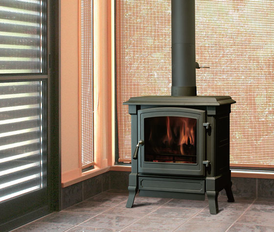 WOODBOX(R)二次燃焼方式の採用による炎の動きを、最大限までワイドに見せる大きな窓がポイントです。