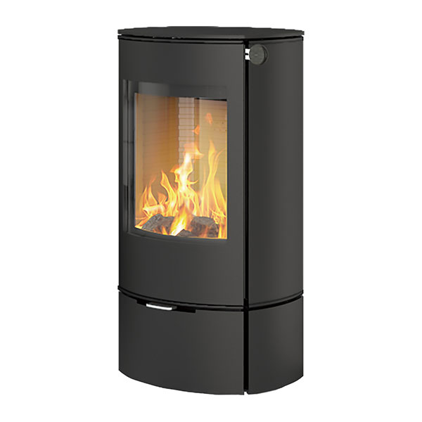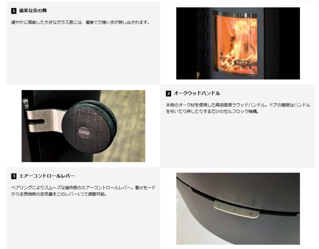 控えめに丸みを帯びたフォルムが、シンプルでありながら華麗な表情を見せるエレガントなストーブ。大きなフロントガラス窓からは優美でダイナミックな炎の舞が愉しめ、心地よい暖かさが部屋全体に広がります。スムーズで操作しやすいエアーコントロールレバーや、引いたり押したりするだけでドアの開閉が可能なセルフロック機構など、高い機能性も兼ね備えています。